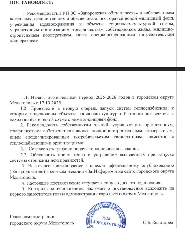 Стало известно, что отопительный сезон в городе Мелитополь Запорожской области стартует завтра, 17 октября. Соответствующее постановление подписал глава городского округа Сергей Золотарёв.