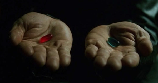Ещё немного об этих таблетках. Возьмём за основу их первоначальное значение: красная — правда, синяя — ложь. Трактовки наделили эту сцену куда более многогранным значением. Синяя таблетка символизирует отказ от отсветственности и принятии её такой, какая она есть, со всеми её плюсами и минусами. Удобный вариант, так как он не требует никаких действий. Это роднит его скорее со знаменитым выбором между двумя коробками, в одной из которых гарантированный выигрыш, а в другой — малый процент на джекпот. В «Матрице» же правда (выбор красной таблетки) требует действий, жертв, страданий, риска, борьбы за нечто ещё более иллюзорное — за руины старого мира, опустошённого войной с нашими собственными творениями. Выбор синей таблетки освобождает от этого бремени. Это вполне себе рациональное и здравое решение, которое помогает избежать боли. На одну эту сцену навешиваются сразу и «а нужно ли выходить из зоны комфорта?» и «меньше знаешь — крепче спишь»; а в противовес — «знание — сила» и «сила в правде».