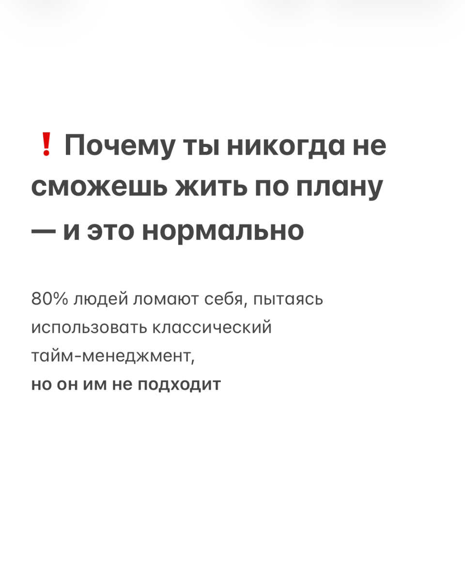 ♦️Почему ты никогда не сможешь жить по плану — и это нормально 80% людей ломают себя, пытаясь использовать классический тайм-менеджмент, но он им не подходит Нас учили, что хороший тайм-менеджмент — это когда план расписан по минутам. А вы четко следуете плану. Но есть нюанс: эта система подходит только одному типу людей, которых не более 20 %. А все остальные, пытаясь ей следовать, чувствуют вину и неудовлетворение – потому что «я опять не успел». На самом деле у людей 3 типа восприятия времени: - линейный - параллельный - циклический Определите свой тип по трем вопросам теста. И прочитайте описание своего типа После этого задания сотни руководителей на тренингах испытывают колоссальное облегчение и возвращают себе право планировать ПО-СВОЕМУ, в соответствии со своим природным ритмом жизни Мини-тест: какой у тебя тип восприятия времени? Отвечай интуитивно — не думай слишком долго. Запоминай, какая буква тебе ближе: A, B или C. 1️⃣ Когда у тебя внезапно срывается встреча, ты