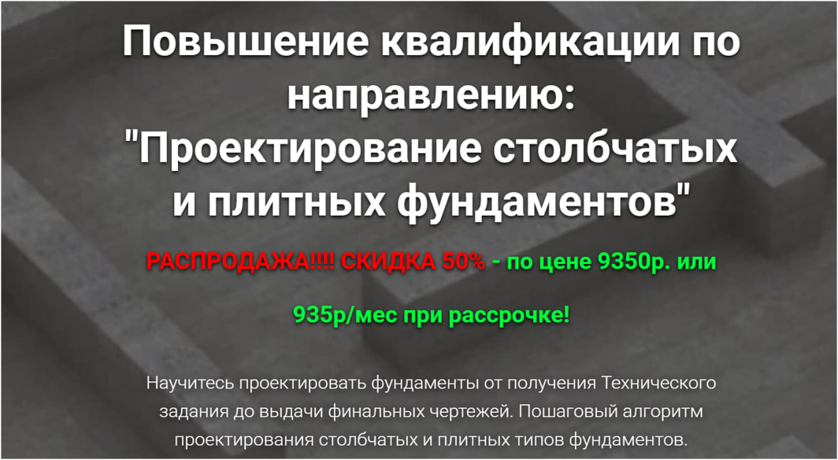 🚩Возращаем цены "бородатых" годов на наш миникурс "Проектирование столбчатых и плитных фундаментов". Скидка 50%: цена 9350р. вместо 18700р. (при рассрочке ежемесячный платеж 935р.) ⚠️Курс будет ближе к Новому году недоступен вообще (т.е. совсем и никогда), так как пришла пора менять формат. Ловите момент зайти на обучение по этому направлению с большой скидкой. 📎Ну, а кто не планирует обучение, просто программу курса ниже посмотрите🙃: 🔻Выпуск 1. Общая вводная. Описание основных конструктивных частей фундамента. Последовательность монтажа. Гидроизоляция. 🔻Выпуск 2. Нормативная литература и программы 2.1. Обзор нормативной литературы 2.2. Обзор расчетной программы, которую будем использовать 🔻Выпуск 3. Анализ исходных данных 3.1. Анализ архитектурных решений 3.2. Анализ каркаса - раздел КМ 3.3. Определение высотных отметок фундамента 3.4. Принцип установки фундаментных болтов 3.5. Определение предварительных габаритов фундамента 3.6. Анализ инженерно-геологических изысканий 🔻Выпус