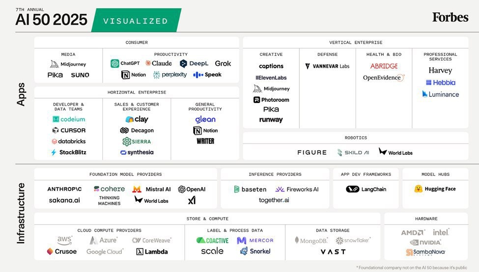📈 Hot AI Tools to Watch in 2025! Have you seen that chart from Sequoia? They made it for Forbes, featuring 50 of their top picks in AI. 🧠💡 It's a fascinating list, but I found a few surprises. Check this out: 1/ Under developer tools, there's Cursor—great product, but owned by Anysphere. Meanwhile, StackBlitz is the company behind Bolt.new. 🤔 2/ Codeium made the cut too. First time hearing that name? Same here! 3/ Notion popped up in the AI Consumer products section, rocking those Cohere models. 📝✨ 4/ And who’s Sakana.ai? Never heard of them until now! Amazing what you can learn from a single slide! 📊 #AI #Research