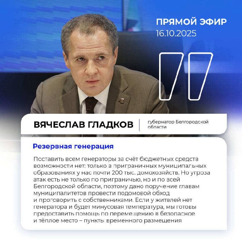 Власти проводят подомовой обход, чтобы определить, сколько жителей имеют резервные источники электроснабжения. Мера введена для контроля ситуации на фоне продолжающихся обстрелов энергетической инфраструктуры. В случае экстренных ситуаций граждан, не обеспеченных альтернативными источниками энергии, будут размещать в пунктах временного размещения. ❕ Жесть Белгород - подписаться 📸 Прислать новость: @predlozhka_zhest_bg