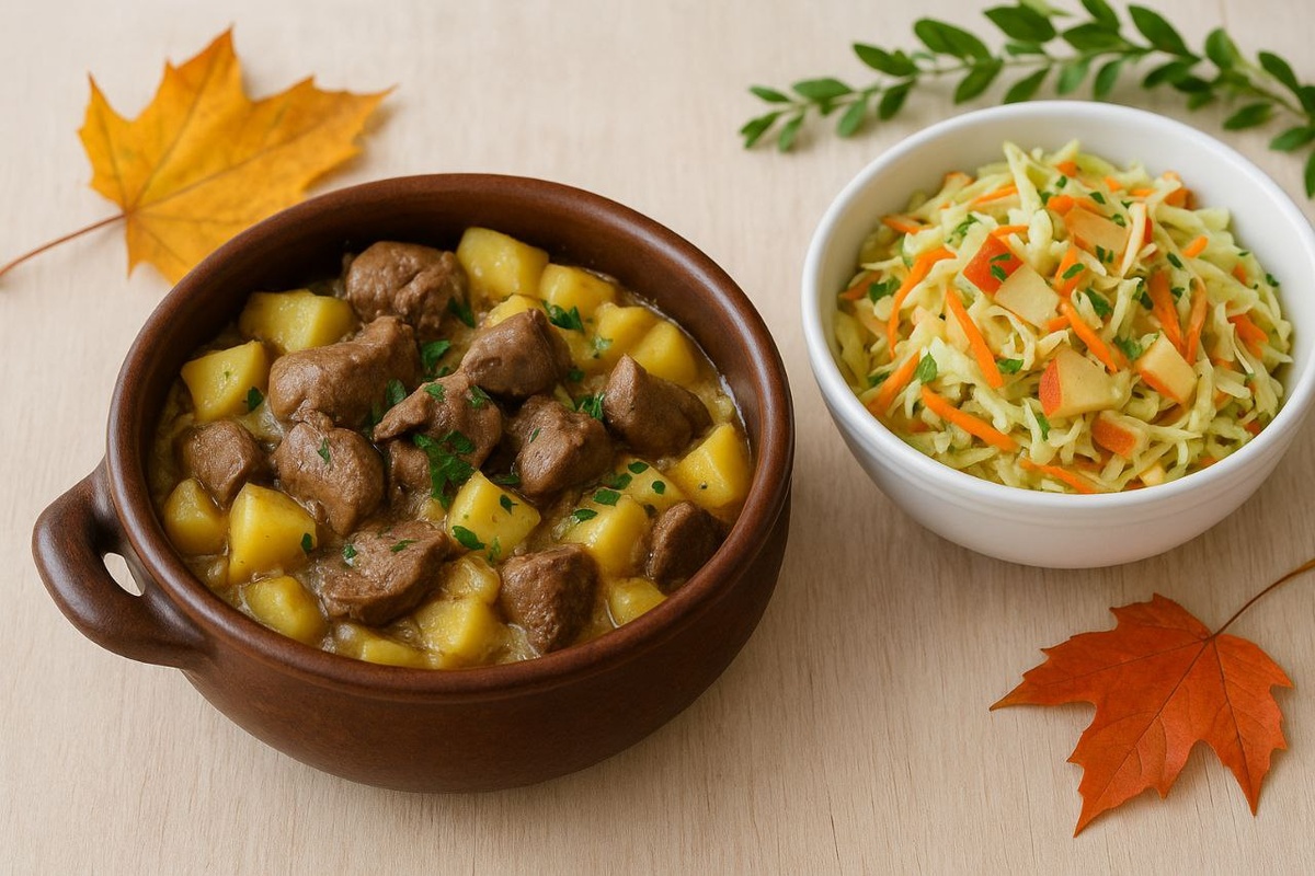 Сегодня у нас вкусное и уютное меню: ✨ Завтрак – овсянка с яблоками и корицей, аромат детства. 🥣 ✨ Обед – мясная солянка, насыщенная и согревающая. 🥘 ✨ Ужин – печень с картофелем в горшочке, прямо как у бабушки. 🥗 Салат – капустный с морковью и яблоком, свежо и легко. 🍐 Десерт – запечённые груши с мёдом, нежный финал дня. А теперь более подробно про ужин 💛 Печень с картофелем в горшочке: Ингредиенты (на 2–3 порции): Куриная или свиная печень – 400 г Картофель – 4–5 шт. среднего размера Морковь – 1 шт. Лук – 1 шт. Сметана – 3 ст. ложки Растительное масло – 2 ст. ложки Соль, перец – по вкусу Сухие травы (тимьян, петрушка, базилик) – по желанию Приготовление: Подготовка ингредиентов: Картофель очистить и нарезать кружочками или кубиками. Лук нарезать полукольцами. Морковь натереть на крупной терке. Печень промыть, обсушить и нарезать небольшими кусочками. Обжарка овощей: На сковороде разогреть растительное масло. Обжарить лук до прозрачности, добавить морковь и готовить 2–3 минуты.