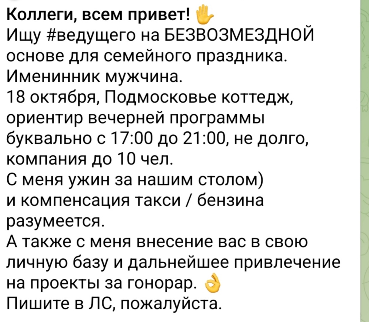 Всем привет. Тот, кто управляет энергией толпы, кто держит в руках не микрофон, а хрупкую химию человеческих эмоций, кто превращает разрозненную публику в единый организм, дышащий в одном ритме. Ведущий — это не голос из динамика. Это архитектор атмосферы. И недавно, листая сообщения в чатах социальных сетей, я вновь встречаю объявления, которые заставляют не улыбнуться, а задуматься о том, как мало наше ремесло понимают со стороны. Звучит почти как анекдот, но за этим стоит устойчивое заблуждение: работа ведущего — это не труд, а приятное времяпрепровождение, которое можно оплатить тарелкой пасты и сомнительным статусом «друга компании». Давайте разберемся, почему этот подход не просто наивен, но и оскорбителен для любой профессии творческой сферы. Инвестиции, которые не съесть За каждым выходом на сцену стоит не только талант, но и капитал. Голос — это годы тренировок и работа с интонацией. Реакция и интеллект — это тысячи часов, потраченных на чтение, анализ, наблюдение за людьм