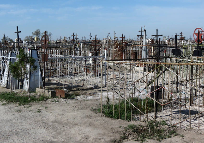 На окраине Кагана, железнодорожного города-спутника древней Бухары, мы с местным жителем выехали к огромному кладбищу на самом краю пустыни: Здесь русские кладбища часто выглядят так - бесконечный частокол покосившихся металлических крестов, и между них ни кустика, а то и ни травинки. И хотя в Кагане ещё остались русские, присматривает за кладбищем пожилая узбечка (таджичка? персиянка? увы, я их плохо различаю "на глаз"). На краю кладбища - воинский мемориал... но не Великой Отечественной. На всех могилах одна дата смерти - 19 апреля 1973 года и подпись "Погиб при исполнении служебных обязанностей". На самом обелиске надписи стёрлись. Ничего конкретного о трагедиях в эту дату мне найти не удалось, но изображение летящих друг другу навстречу самолёта и вертолёта наводит на мысль о столкновении двух воздушных машин на учениях, а вот дата заставляет подозревать какую-то связь с войной во Вьетнаме. Сделан мемориал очень сильно: лишь издалека заметно, что надписи на обелиске складываются в