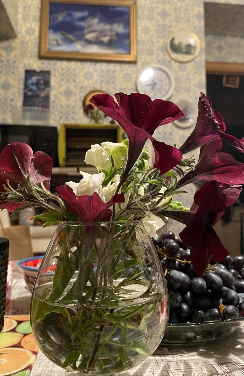 Когда-то давно, молодыми, мы жили с мужем в Ленинграде. Он с каждой зарплаты приносил мне тюльпаны, они во множестве продавались рядом со станцией метро Технологический институт. Тюльпаны и ещё, жареные семечки в кульке из газеты, семечки моё любимое лакомство тогда было. А себе он покупал пироженку, я их не любила. Вчера он мне тоже принёс цветы, последние, оставшиеся в живых. Я люблю цветы, всякие, могу заполнить ими любую ёмкость. Которые белые даже пахнут, на герань похожие. Мелочь, а приятно. Найдите на одном из фото нашу киску Шоколадку. Вот такие новости из Карелии от вашей Моны. Фото мои.
