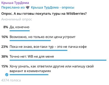 «Тур на Wildberries куплю сразу после того, как квартиру приобрету там же» – примерно такой уровень готовности использовать новую площадку у большинства из участников опроса на Крыше. Мы открыли его 14 октября, поскольку уж очень большой резонанс вызвала новость о том, что «Дикие ягоды» дают скидку 7% на туры F&S. Результаты опроса пока не слишком радужные для участников коллаборации: всего 8% из более 4 тыс., безусловно, готовы покупать на маркетплейсе туры. 16% – только если устроит цена. 38% отказываются это делать наотрез. 23% колеблются, поскольку осознают, что «тур – это не пачка кофе». Посмотрим, что будет дальше. А пока в новости на ТурДоме обобщили мнения, какую категорию туристов маркетплейсы могут отобрать у турагентов. И добавили как обычно заслуживающий внимание инсайд – для тех, кто читает новости до конца и между строк. @tourdom