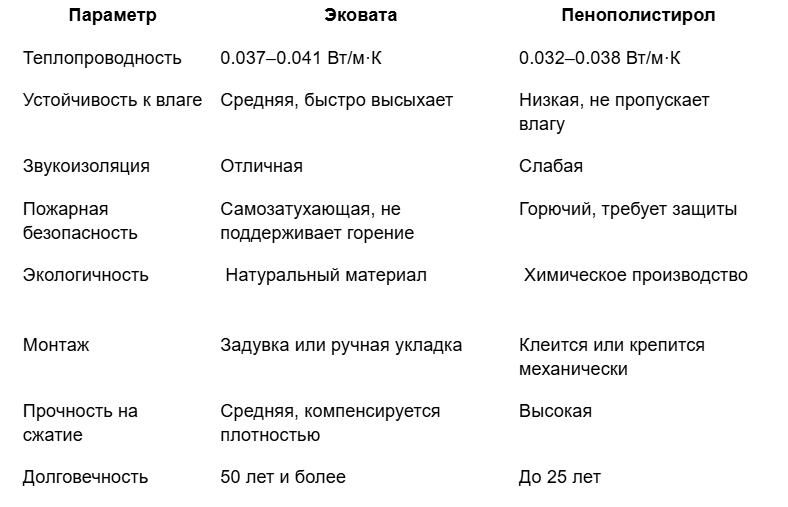 Уже из таблицы видно: по ряду важных характеристик (безопасность, звукоизоляция, экологичность) эковата выигрывает.