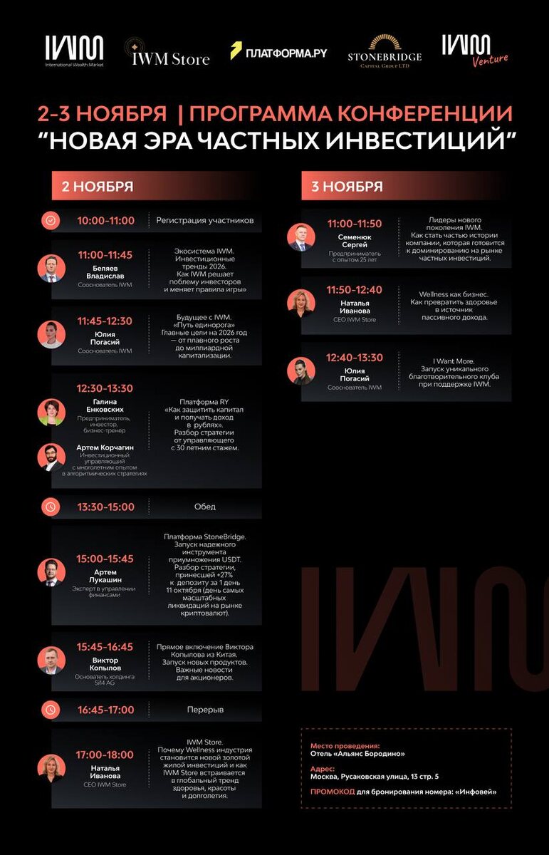 🔥 Новая эра частных инвестиций начинается в Москве 2–3 ноября | Отель «Альянс Бородино» | IWM Conference Мир инвестиций меняется. Теперь не фонды диктуют правила — а частные инвесторы. 📈 Сегодня любой человек с капиталом от $100 может стать частью сделок, которые ещё вчера были доступны только фондам и инсайдерам. Именно об этом — форум “Новая эра частных инвестиций” от IWM (International Wealth Market). 💡 Что ждёт участников: Как сохранить и приумножить капитал в эпоху турбулентности; Как выстроить личный инвестиционный план под свои цели; Как стать финансовым терапевтом — новой профессией, объединяющей финансы, психологию и стратегию; Как зарабатывать на трендах wellness-индустрии, венчурных проектах и частных фондах; И самое главное — как создать капитал, который работает вместо тебя. 🎤 Среди спикеров: Владислав Беляев — International Wealth Market, co-founder. Как IWM меняет “правила игры” на рынке инвестиций и что ждёт частных инвесторов в 2026 году. Юлия Погасий — Internati