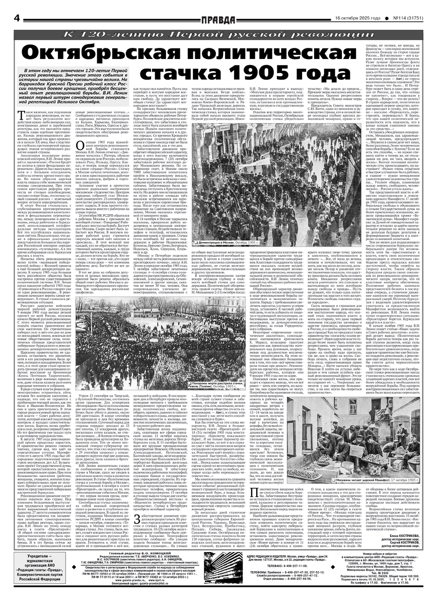 120 лет первой народной революции. Кто на самом деле остановил царский произвол? В новом номере «Правды» - масштабный анализ событий Октябрьской политической стачки 1905 года. Авторы, доктора исторических наук Елена и Сергей Костриковы, на основе документов и статей В.И. Ленина доказывают: ✅ Почему революция 1905 года стала генеральной репетицией Великого Октября. ✅ Как стихийный протест перерос во Всероссийскую стачку, парализовавшую империю. ✅ В чём была сила классовой солидарности рабочих, преодолевшей национальные и религиозные барьеры. ✅ Как царский манифест 17 октября расколол оппозицию и почему буржуазия «предала своих союзников». 💬 Цитаты, которые говорят сами за себя: «Барометр показывает бурю!.. Всё и вся сорвано уже с места гигантским вихрем солидарного пролетарского натиска». — В.И. Ленин «Москва отрезана от России... Что-то кошмарное творится на Руси... Всё возможно — вот в какую полосу истории мы вступили». — М. Меньшиков, правый публицист («Новое время») Эти слова показ
