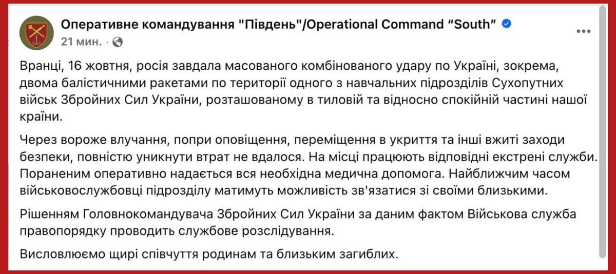 Сегодня РФ двумя баллистическими ракетами ударила по учебному подразделению террористов ВСУ в тыловой, относительно спокойной части Украины
