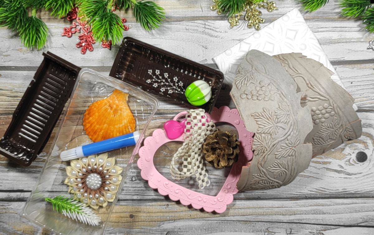 Добрый день, дорогие друзья. Надеюсь многим эта статья будет полезна, ведь не все хотят тратиться на силиконовые молды, которые потом могут вовсе и не пригодиться. Поэтому нужно осмотреться вокруг себя, что-то обязательно да попадётся на глаза. Что мы ищем? Ищем всё, что имеет любой рельефный рисунок. У меня нашлись вот такие «сокровища»: разбитый пластиковый горшок (отломала рельефные детали), куски потолочной плитки с узорами, коробочки от печения с рельефным дном, старый фломастер с подходящим колпачком, детская резиночка с бусинами, бисерная веточка, крышка от детской шкатулочки и ещё несколько мелочей. И это ещё далеко не всё! Если честно, хотела ещё часть пластиковой коробки от торта и резиновый тапок «привлечь» (уж очень интересный рисунок на подошве), но вовремя остановилась – перебор). Специально искала то, что может оставить отпечаток (оттиск) на воздушном пластилине. Все эти детали-молды протестировала на кусочках лёгкого пластилина. Некоторые результаты очень порадовал