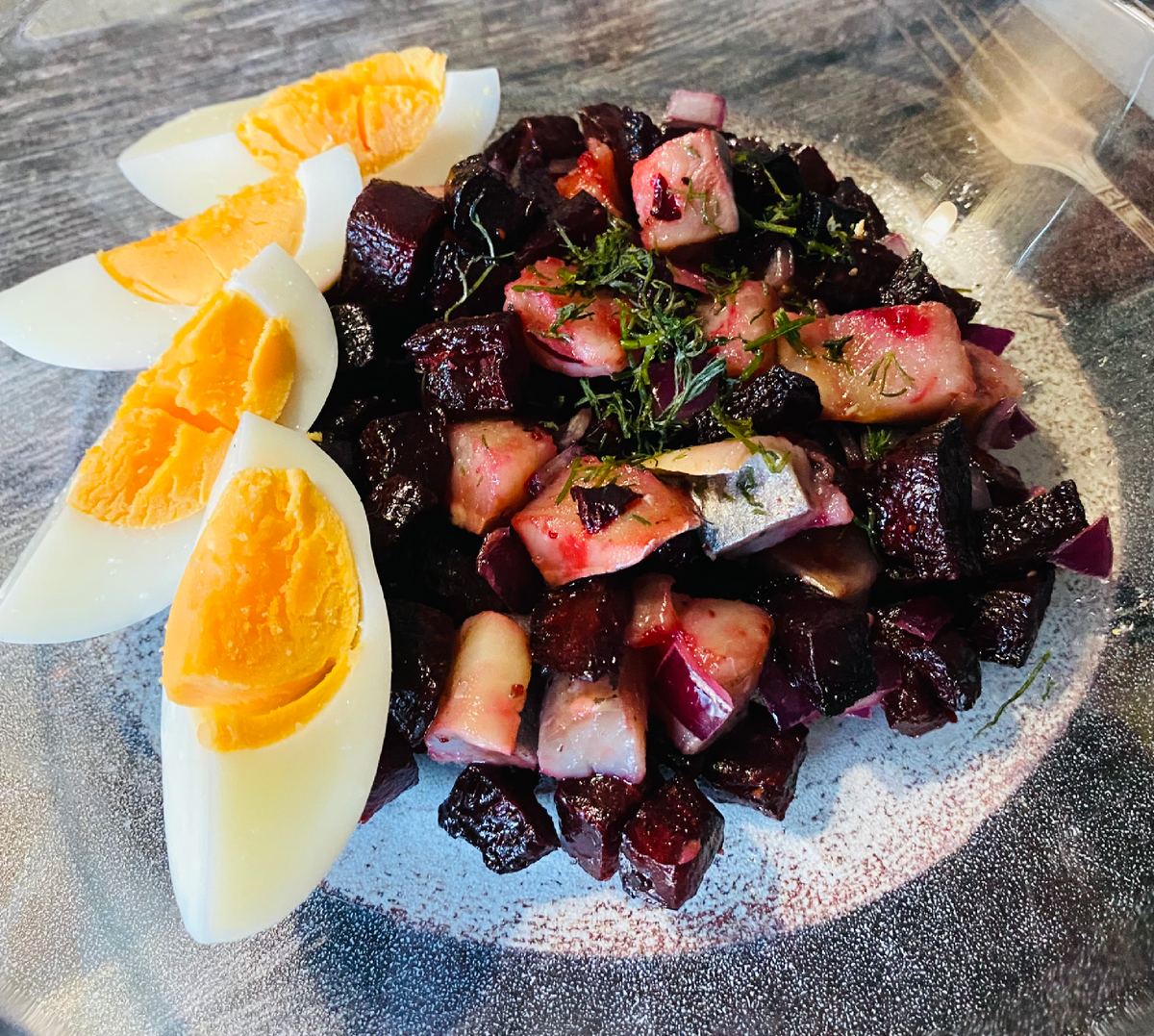 - Готовую запеченную свеклу смешиваем с селедкой и луком. Хорошо перемешиваем, пробуем на соль-перец-масло. Добавляем их при необходимости и подаем порционно, украсив четвертинками яиц по-китайски.