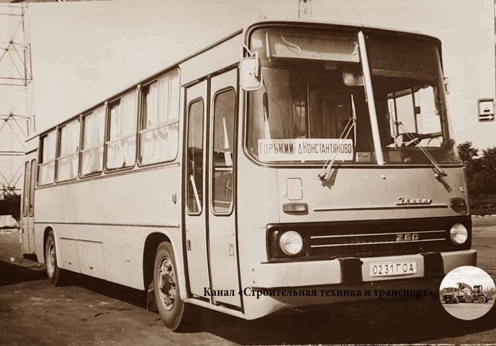 В 1982 году город Горький получил партию венгерских пригородных автобусов Икарус-260. Прежде на пригородных маршрутах использовались обычные 3-дверные городские Икарусы-260. Новые машины отличались 4-рядной планировкой сидений и двумя дверями, причем не ширмовыми, а планетарными. Что интересно, в процессе эксплуатации некоторые из этих автобусов оснащались «мягкими» сиденьями от списанных Икарусов-255 и работали уже на межгороде с соответствующей надбавкой к цене. Фото новейшего автобуса, работающего на маршруте Горький – Дальнее Константиново, я сделал на автовокзале близ площади Лядова (ныне не существующем) в 1982 году.