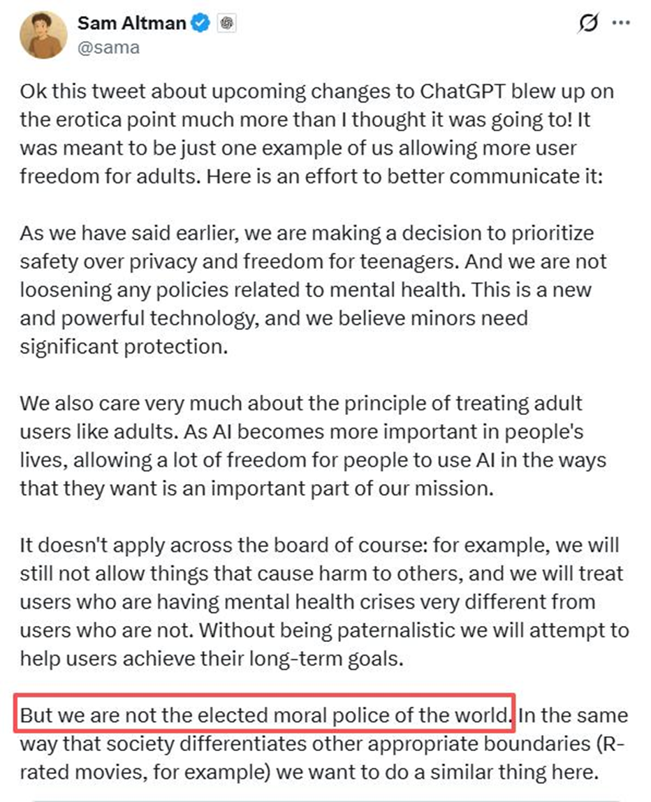 Глава OpenAI Сэм Альтман заявил: компания «не избрана мировым моральным полицейским» и будет «осторожно» смягчать большую часть контент‑ограничений, включая допуск взрослого контента для верифицированных совершеннолетних пользователей.