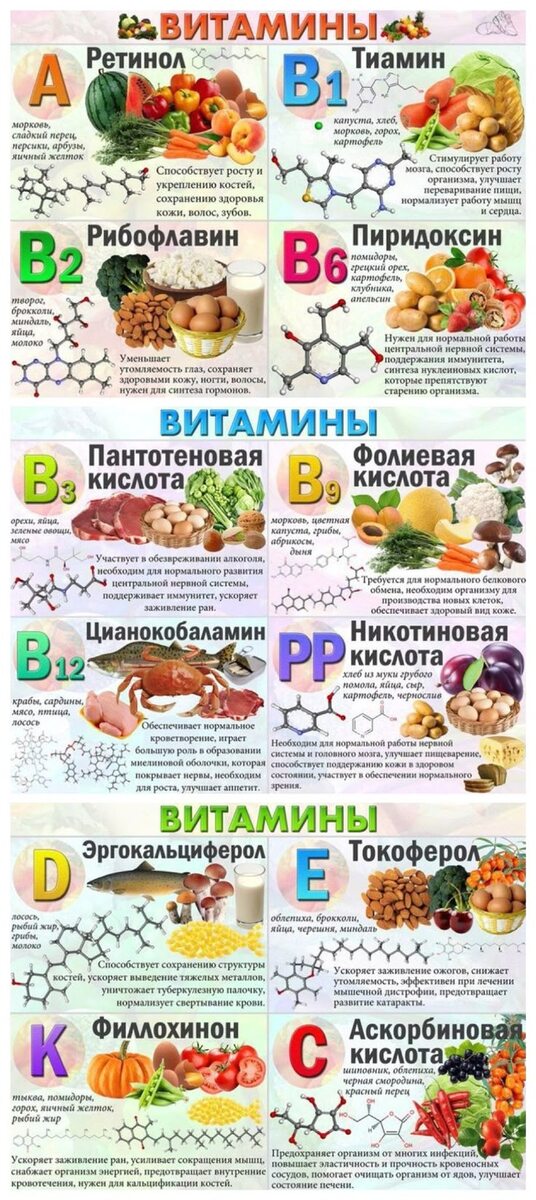 Витамины в спорте Для достижения высоких результатов в спорте важно поддерживать организм необходимыми витаминами и минералами. Вот список основных витаминов и минералов, необходимых спортсменам, и их роль в организме: Основные витамины для спортсменов 1. Витамин A Источники: морковь, сладкий картофель, шпинат, печень. Польза: улучшает зрение, поддерживает здоровье кожи и слизистых оболочек, способствует восстановлению тканей после тренировок. 2. Витамин D Источники: жирная рыба, яйца, обогащённые продукты. Польза: укрепляет кости и мышцы, повышает иммунитет, участвует в усвоении кальция и фосфора. 3. Витамин E Источники: орехи, семена, растительные масла. Польза: антиоксидант, защищает клетки от повреждений, ускоряет восстановление мышц после нагрузок. 4. Витамин C Источники: цитрусовые, киви, клубника, брокколи. Польза: усиливает иммунную систему, помогает синтезировать коллаген, улучшает усвоение железа. 5. Витамины группы B B1 (тиамин): энергия, обмен веществ. Источник