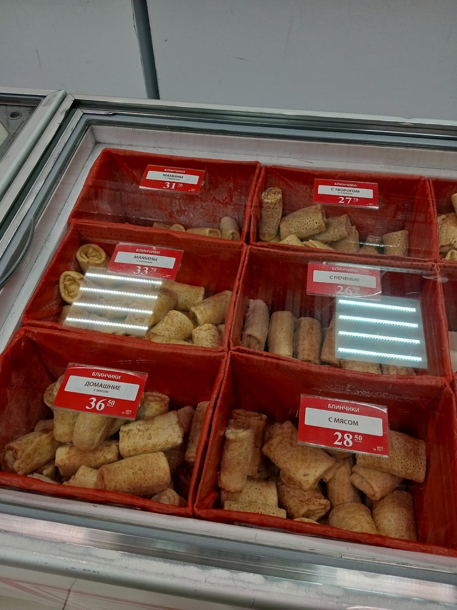 У них совершенно не сладкий сам блинчик, мясной начинки уже не так много, но для меня это как раз идеальный баланс. Они не сухие, у них не преобладает один какой-то вкус, при этом блины сытные. Мне не попадалось еще никаких косточек или чего-то другого в фарше, пока что могу поставить им четверку с минусом и отнести к списку покупок.