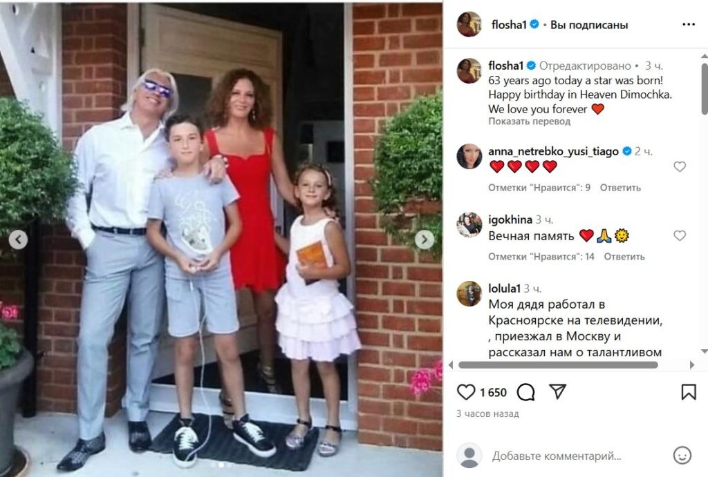 Соцсети вдовы Хворостовского На одном из снимков была запечатлена вся семья: Хворостовский, его жена и их дети. На другом фото артист стоит вместе с наследниками на сцене. Пост Флоранс ожидаемо растрогал интернет-пользователей. Под публикацией поклонники поминали звезду и сокрушались о том, что жизнь артиста оборвалась столь рано. Дмитрий Хворостовский с детьми «Вечная память»; «Помню всегда и люблю»; «Спасибо за эти красивые фотографии»; «Всегда помним»; «Он всегда с тобой. Надо радоваться за него»; «С како
