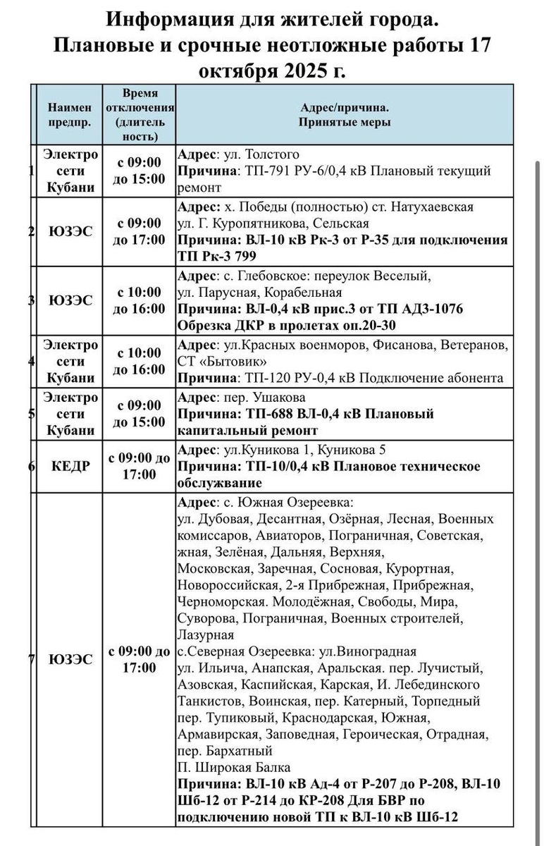 ‼️ Плановые отключения на 17.10.2025г. 🤩 Подписаться | БОТ ННН