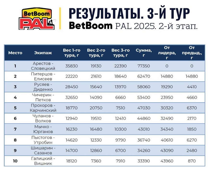 14-й турнир Лиги Профессиональных Рыболовов. Экипаж Максим Арестов и Евгений Словецкий, выступавшие на лодке ФЛ-70 — Победители Финального этапа BetBoom PAL2025! Их результат составил 77 килограмм 350 грамм☄️ 2️⃣ Вторыми, с результатом 62 470 г, стал экипаж Питерцов — Елисеев; 3️⃣ На третьей строчке – Русяев — Диденко с результатом 58060 г; 4️⃣ Экипаж Чичерин — Петков (53400 г) — четвертые; 5️⃣ Замыкает ТОР-5 экипаж Прохоров — Карчинский их результат 47030 граммов. Поздравляем!)