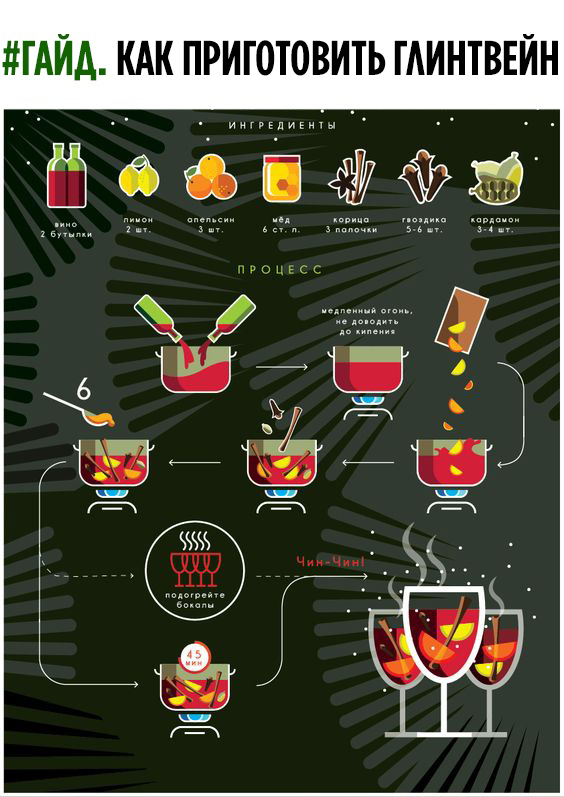 Краткий гайд о том , как приготовить глинтвейн в домашних условиях Глинтвейн можно приготовить в домашних условиях на основе красного или белого вина, а также на фруктовом или ягодном соке. Ниже представлены рецепты трёх вариантов: классического из красного вина, из белого вина и безалкогольного. Ингредиенты на одну порцию: Приготовление: Ингредиенты: Приготовление: Ингредиенты: Приготовление: