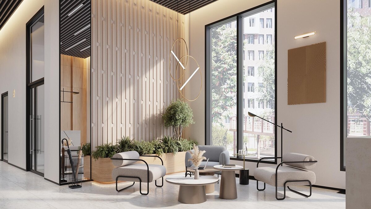 Дом — это не только квадратные метры за закрытой дверью. Он начинается раньше, чем мы поворачиваем ключ в замке, и продолжается за пределами квартиры. Именно в лобби городской ритм сменяется ощущением уюта и защищённости. Архитекторы ÁLIA сделали эти пространства частью философии проекта, понятной как как молодой, так и взрослой аудитории — вечные ценности в современном прочтении. В каждом урбан-блоке – своё мастер-лобби. Авторский дизайн от Pergaev Bureau придает каждому из них неповторимость, сохраняя при этом единый дизайн-код проекта: премиальные материалы, понятную навигацию и продуманную функциональность. Здесь проходят концерты и кинопоказы, можно поработать, провести вечер с соседями, понаблюдать за играми детей или просто расслабиться в кресле с книгой. CITY 1: масштаб и статус Центральное лобби урбан-блока CITY 1, как парадный портрет. Здесь ощущается масштаб и статусность: высокие потолки — более 4,5 метров, панорамное остекление, динамичные линии, акцентные материалы, комф