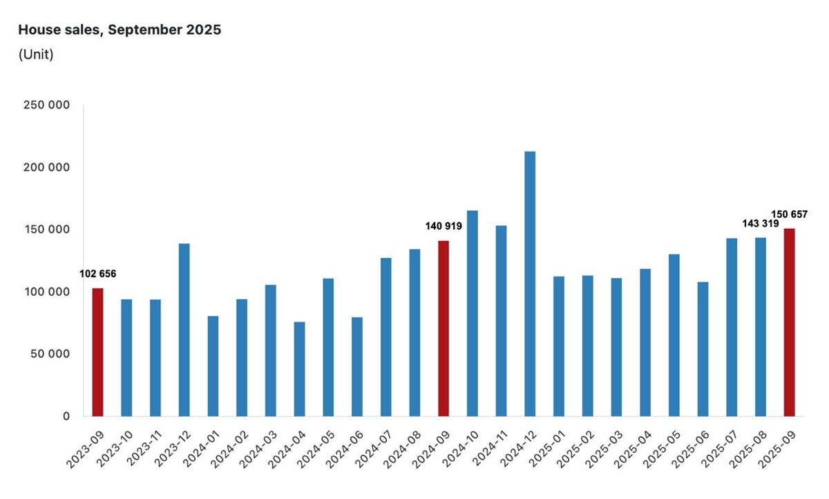 📣Продажи жилья в Турции растут, но не за счет иностранцев Турецкий институт статистики поделился новыми данными по рынку недвижимости в Республике. В сентябре 2025 года в Турции было продано 150 657 домов — на 6,9% больше, чем годом ранее. По итогам первых девяти месяцев года рынок показал ещё более уверенный рост: продажи увеличились на 19,2%, достигнув 1 млн 128 тыс. 727 объектов. 🔝Лидеры по числу сделок традиционны: • Стамбул — 24 119 продаж, • Анкара — 13 417, • Измир — 8 544. Аутсайдеры — Ардахан, Байбурт и Тунджели, где за месяц продано меньше 150 домов. Как покупают: • Ипотечные сделки выросли сразу на 34,4%, составив 21 266 продаж — 14% рынка. • Остальные 86% — это покупки без кредитов. • На первичном рынке — 47 117 продаж (+5%), • На вторичном — 103 540 (+7,8%). Таким образом, две трети сделок в стране приходится на вторичный рынок — то есть на объекты, уже бывшие в собственности. 🌏Увы, иностранцы продолжают снижать активность На фоне роста внутреннего спроса, покупки ин