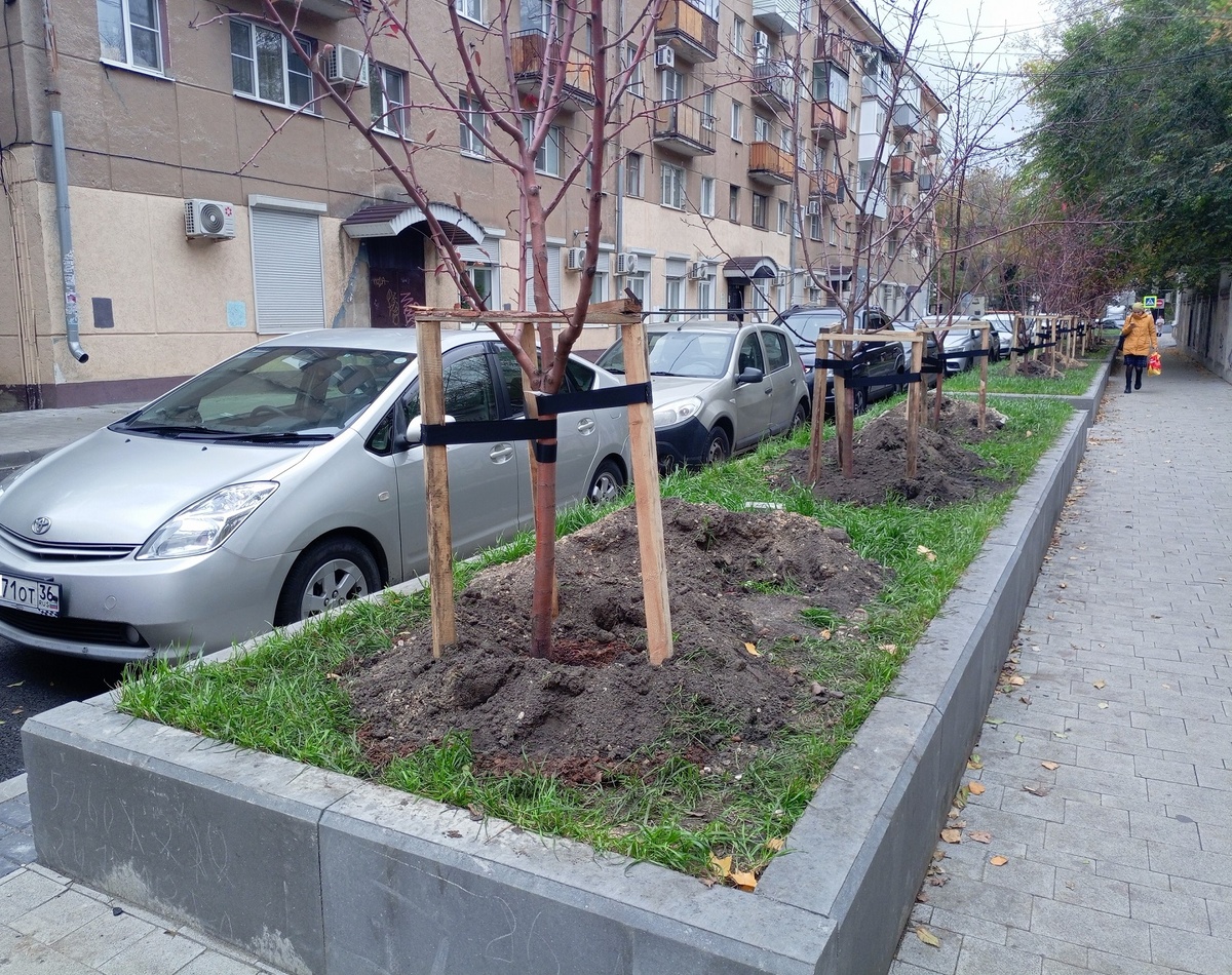 Помимо привычных для воронежцев зелёных насаждений - кизильника, липы и ели - на улице появились декоративные яблони сортов Роялти и Маковецкого. Эти деревья отличаются не только эффектным внешним видом, но и высокой устойчивостью к морозам и засушливым периодам, что особенно важно для климата Центрального Черноземья.