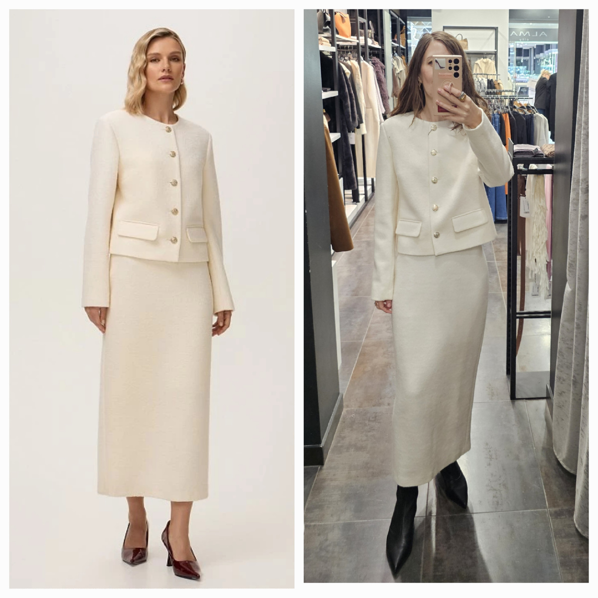 Очень красивый костюм: ткань, цвет, фасоны- все прекрасно. Он сшит из вареной смесовой шерсти- очень уютный, при этом выглядит дорого. Вещи, в него входящие, отлично поработают в гардеробе как вместе так и по отдельности. Есть ещё в черном цвете, но в белом эффектнее выглядит.