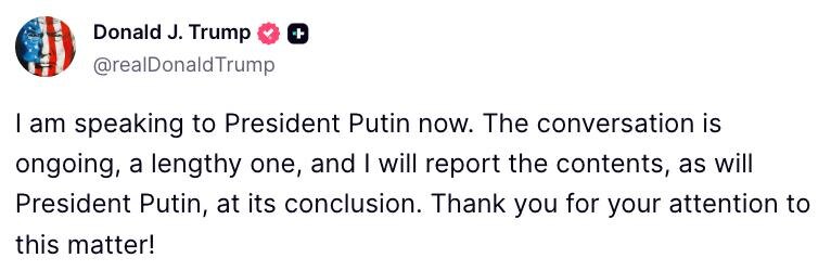 🇺🇸🇷🇺 Дональд Трамп: Я сейчас разговариваю с Владимиром Путиным. Разговор продолжается, сообщу о его содержании после завершения.