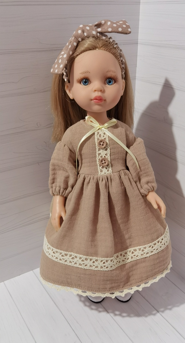 "В кукле все должно быть прекрасно: и лицо, и прическа, и платье, и обувь, и исподнее" - так размышляла я, глядя на новое платье, которое я сшила из муслина цвета кофе с молоком. И на Карлу (Паола Рейна), облачившуюся в это платье. Фасон и отделка платья потебовали "продолжения банкета" в виде создания повязки-резинки на голову. Дальше - больше. Возник вопрос о панталонах и чулочках, которые завершили бы этот симпатичный полудеревенский образ. Я сшила и то, и другое. Стали с Карлой примерять. Все отлично налезло, но... не захотело между собой комбинироваться по причине чулочных кружавчиков, просвечивающих сквозь батист панталон. На фото видно не очень, но я-то вижу! Решила сшить вторые панталоны - покороче. Получилось довольно смешно: пришлось присборивать штанины панталон кверху и приспускать чулки книзу... Карла держалась стойко. На этом я не успокоилась, так как в голову пришла очередная гениальная идея - сшить вместо чулок - носки! И это было бы действительно гениально, если бы я н