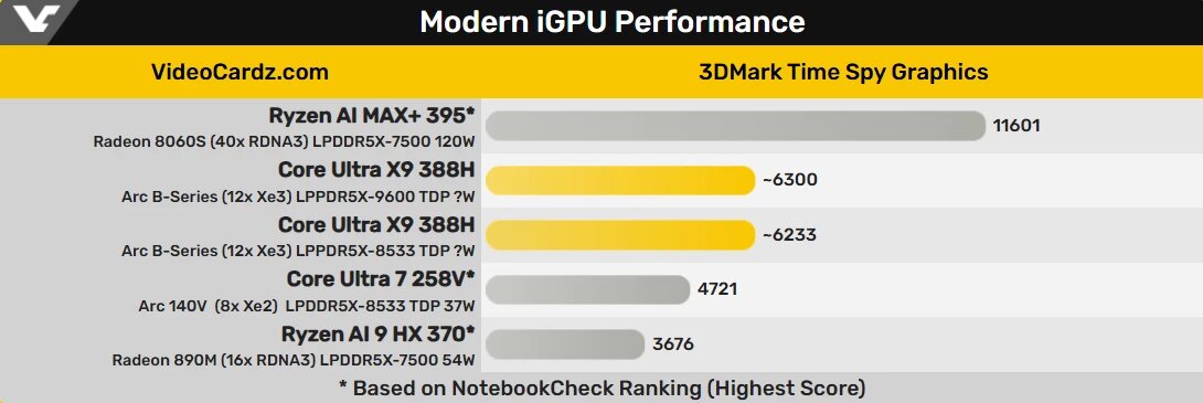 Новый флагманский мобильный процессор Intel, Core Ultra X9-388H из грядущей серии Panther Lake, показывает значительное превосходство во встроенной графике по сравнению с предыдущим поколением. Согласно первым тестам, его iGPU на архитектуре Arc Xe3 более чем на 30% опережает графику в чипах Lunar Lake. В популярном бенчмарке 3DMark Time Spy графическая подсистема нового процессора набрала свыше 6300 баллов. Для сравнения, лучшие результаты iGPU Arc 140V в составе процессоров Lunar Lake не превышали 4721 балла. Такой скачок производительности стал возможен благодаря новой архитектуре и увеличенному до 12 числу Xe-ядер в графическом блоке. Помимо чистого прироста скорости, Intel заявляет и об улучшенной энергоэффективности: на 40% выше, чем у Arrow Lake-H, и на 50% — чем у Lunar Lake. Это означает, что ноутбуки на базе Panther Lake смогут предложить не только более высокую производительность в играх и рабочих задачах, но и увеличенное время автономной работы.