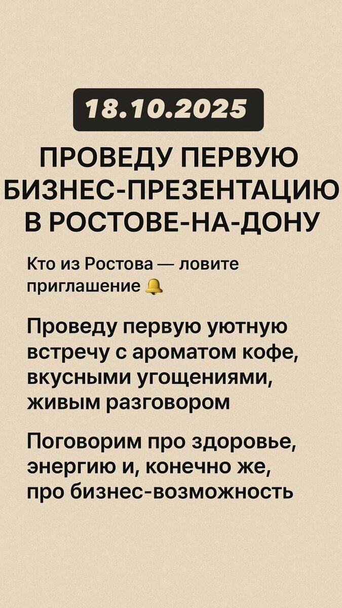 🌿 *Бизнес презентация возможностей с Verum Global в Ростове-на-Дону* 18 октября в 15:00 мск приглашаю вас на живую встречу в уютной атмосфере — с ароматом кофе, вкусными угощениями и искренними разговорами о главном: ⠀ 💼 Откроете для себя новые источники дохода и карьерного роста , не зависимо от возраста, профессии или опыта. ☕️ О нутрицевтиках нового поколения — с собственной научной базой и разработками наших российских учёных , на которые ушли 55 лет исследований . 🤝 О команде, где каждый может найти своё место и начать новую главу жизни. ⠀ ☕️ Формат встречи: уютная атмосфера, кофе-брейк, живое общение и ответы на ваши вопросы. 📍 Место проведения: Ворошиловский проспект 12/85 офис 8 . Пространство Мысль 🕓 Время: 15:00 МСК ⠀ Иногда одно знакомство может изменить всё.
