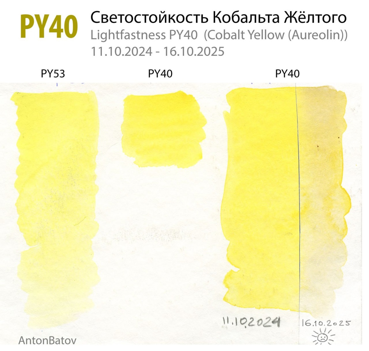 Изменения оттенка PY40 исторического Ауреолина (Кобальта жёлтого) за год на окне. Острая необходимость этого пигмента с постоянной периодичностью обсуждается в блогах, с предложениями ввести его в палитру Экстры. Ещё раз можно вспомнить моё ворчание по поводу красивых маркетинговых названий красок, широко применяемых без указания пигментов. Сейчас "ауреолином" разными фирмами называются краски на пигментах: PY40, PY150, PY151, PY175. Путайтесь на здоровье! #watercolor #PY40 #ArtBatArsenal #акварель #краски #выкраска #акварельныекраски #пигмент #Lightfastness #светостойкость
