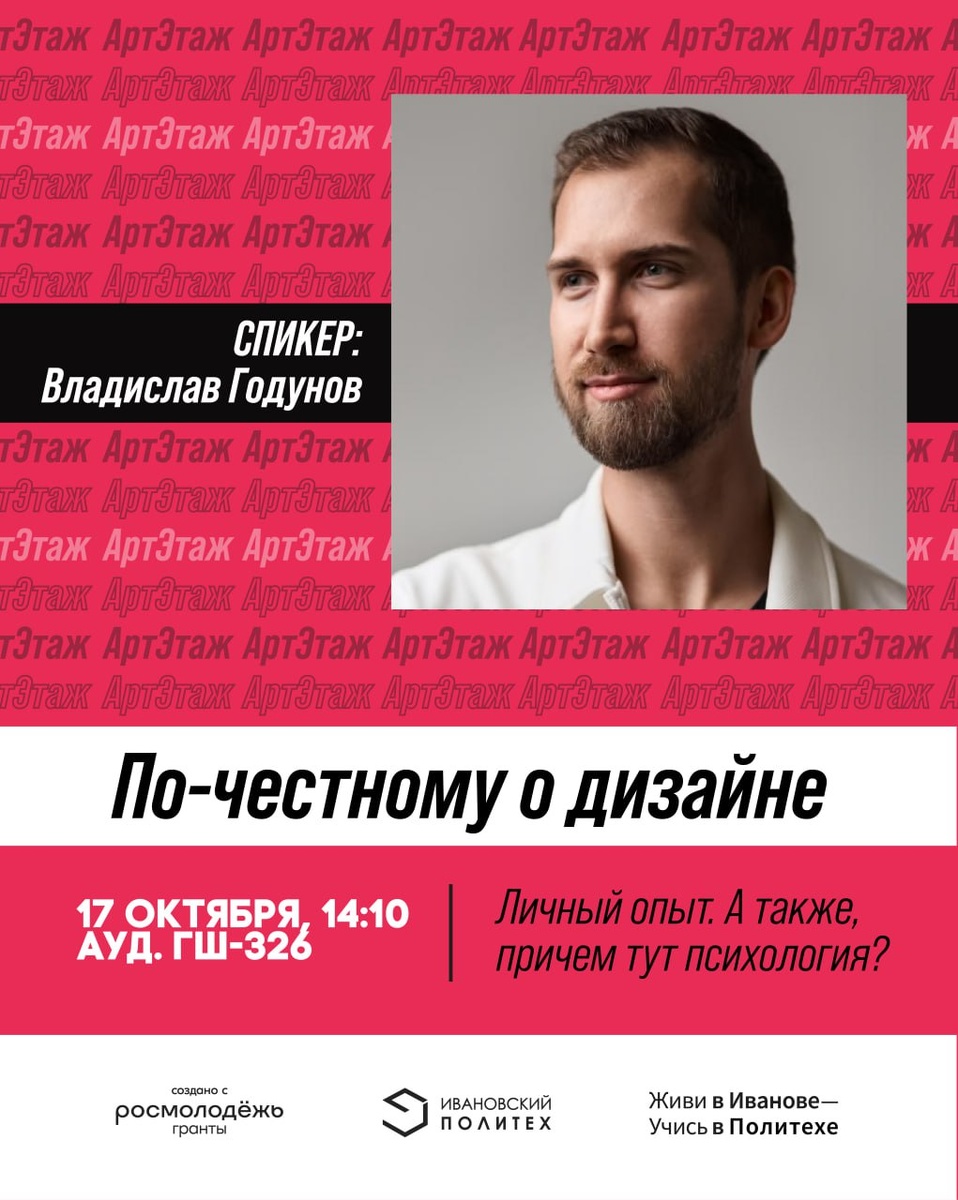 По-честному о дизайне Владислав Годунов — основатель студии God.Knows, дизайнер и арт-директор, а еще наш выпускник 📆 Приходите 17 октября в ауд. ГШ-326 Владислав поделится личным опытом о том, как пришел в дизайн и как дизайн связан с психологией. ⌚️Начало в 14:10 ✏️Регистрация в проекте «Наш АртЭтаж» – на месте Проект «Наш АртЭтаж» реализуется при грантовой поддержке Федерального агентства по делам молодёжи — Росмолодёжь. #РосмолодёжьГранты #Росмолодёжь #Наш_АртЭтаж #ЖививИванове_УчисьвПолитехе