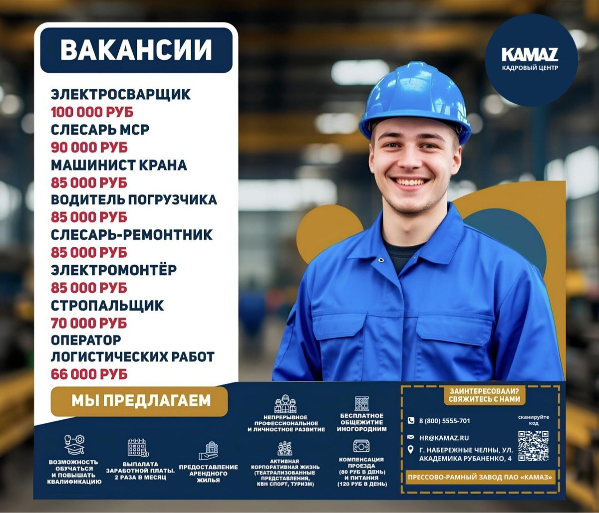 💪 КАМАЗу нужен именно ты! От нас вы получите: — выплаты 2 раза в месяц — компенсация питания и проезда — множество социальных льгот — корпоративные скидки — обучение профессии — жильё для иногородних Готовы оставить свой след в истории отечественного автопрома? Тогда откликайся удобным способом: 🔹 заполните анкету кандидата; 🔹позвоните по телефону 8 (800) 5555-701; 🔹 или посетите Кадровый центр KAMAZ по адресу: ул. Академика Рубаненко, 4 (1/06). Ждём в нашей команде профессионалов!