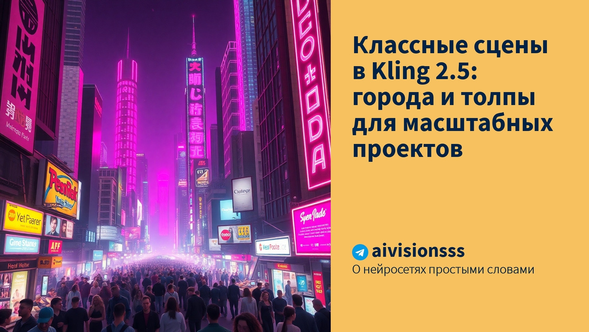 Создайте уникальный, цепляющий мета-описание длиной 115-130 символов, которое подчеркнет возможности Kling 2.5 для масштабной визуализации городов и сцен с толпами.