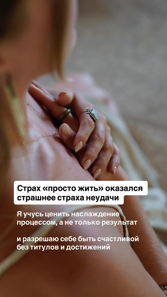 1️⃣Страх 'просто жить' оказался страшнее страха неудачи. Я учусь ценить наслаждение процессом, а не только результат, и разрешаю себе быть счастливой без титулов и достижений