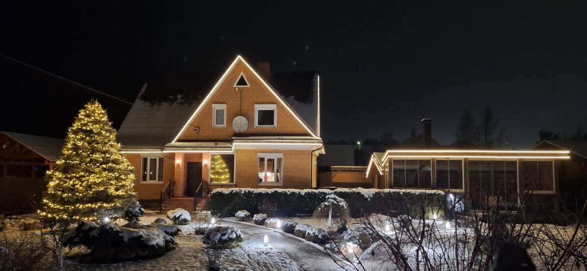 Подсвечиваются карнизы, окна, углы, входная группа. Мягкое, равномерное освещение делает дом монументальным и «тёплым» визуально. 2. Современный