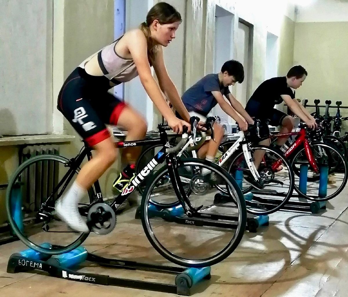 Оказывается, субботний день для велосипедистов – не выходной. В актовом зале заводоуправления бывшего мебельного комбината, где дислоцируется велосипедная секция, к полудню заканчивалась шестая тренировка за неделю. В это время я ещё застал мокрых от пота спортсменок, усиленно крутящих педали на велостанках. Мне оставалось только удивляться: шесть тренировок в неделю по два с половиной часа! Вот такой это спорт. Слишком высока цена победы и драгоценных секунд на гонках!
