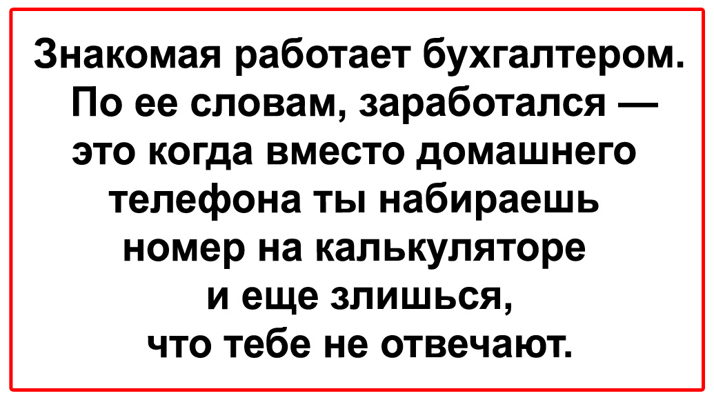 Знакомая работает бухгалтером. По ее словам, заработался — это когда вместо домашнего телефона ты набираешь номер на калькуляторе и еще злишься, что тебе не отвечают. © Suginto / Pikabu