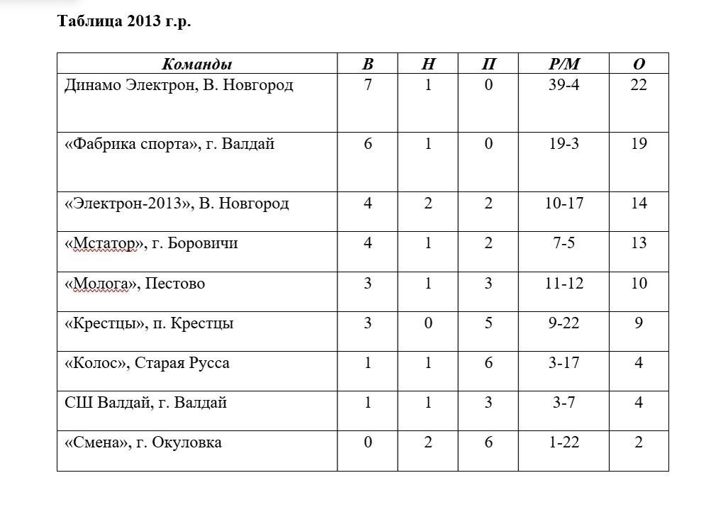 Турнирная таблица чемпионата Новгородской области по футболу среди юношей 2013 года рождения