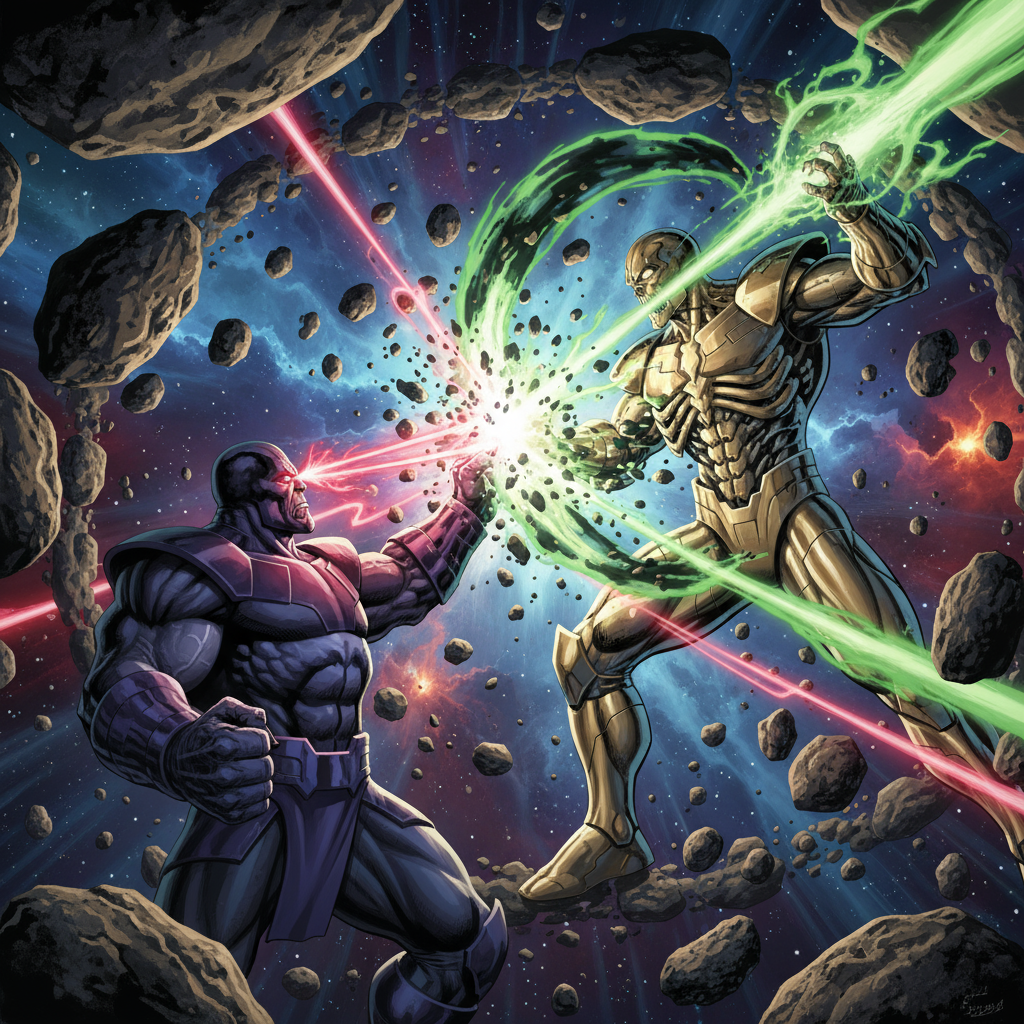 «Война Дарксайда» — хроника столкновения двух абсолютов: тирании и пустоты. Анти‑Монитор, ранее известный как Мобиус, — существо антиматерии, привыкшее стирать вселенные как цифры с доски. Дарксайд — принцип подчинения, который не стирает, а выключает свободу. Их философии не совпадают, а значит — конфликт неминуем. На Земле это столкновение стало не просто бойней, а перераспределением ролей. С ранних номеров герои получают божественные функции. Бэтмен садится на Кресло Мобиуса — артефакт знания — и становится богом информации: он знает ответы, но платит потерей доверия. Флэш сливается с Черным Гонцом — сущностью смерти — и его бег превращается в космический ритуал. Супермен попадает в огненные ямы Апоколипса, меняет заряд солнца на заряд тьмы и возвращается другим — сильнее, но опаснее для близких. Шазам пересобирает свой пантеон, получая новых богов вместо древних. Лекс Лютор, прагматик и соперник Супермена, получает власть над Апоколипсом и примеряет на себя роль «бога» этого м