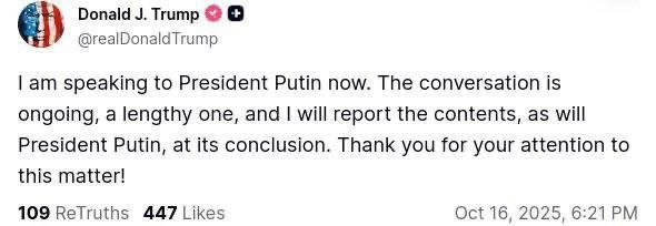 ❗️⚡️Трамп сообщил, что сейчас по телефону разговаривает с Владимиром Путиным «Я сейчас разговариваю с президентом Путиным. Беседа продолжается, она довольно продолжительная. По её завершении я сообщу о содержании разговора — как и президент Путин. Спасибо за ваше внимание к этому вопросу!» https://dzen.ru/id/6425916a1950720421f18802