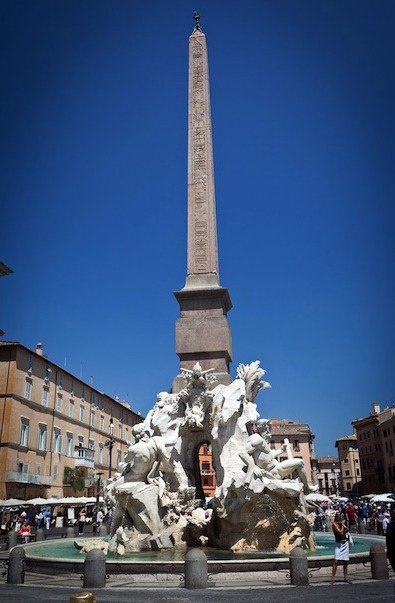 Это произведение искусства на площади Навона символизирует известный мир того времени и во многих отношениях является великолепным образцом кинематографа. Джанлоренцо Бернини (1598–1680), также известный как Джованни Лоренцо Бернини, оставил свой неповторимый след в скульптуре после Микеланджело. Одной из его отличительных черт было сочетание скульптуры и архитектуры. Это можно увидеть в его «Фонтане четырёх ручьёв» на римской площади Навона. Здесь изображен известный тогда мир четырёх континентов на примере их крупнейших рек: Ганга, Рио-де-ла-Плата, Нила и Дуная. Австралия как пятый континент была впервые открыта европейцами в 1606 году голландцем Виллемом Янцем. «Фонтан» можно описать одним словом: это великолепное кино. В центре котловины возвышается огромная скала из травертина с четырьмя речными богами по бокам и обелиском высотой 21 м на вершине. Кстати, скала полая внутри, что было сенсационным сооружением для того времени. Из этой скалы повсюду струится вода – вероятно, это был