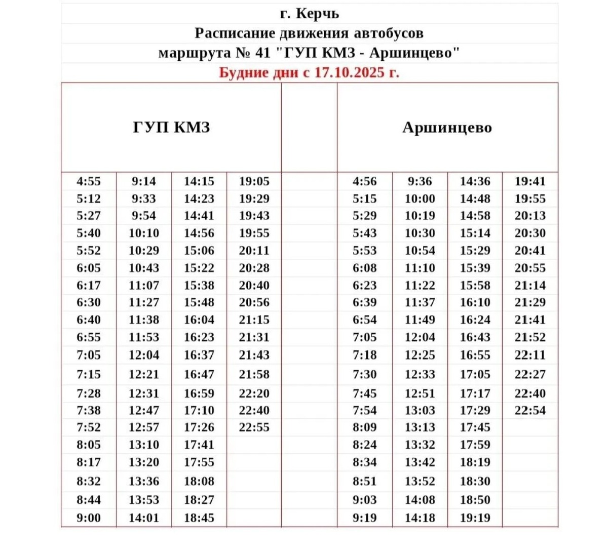 С 17.10.2025 г. будет изменено расписание движения автобусов на муниципальном маршруте регулярных перевозок №41 «ГУП КМЗ – Аршинцево – Горпляж.