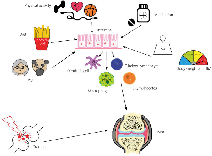 Роль кишечника переваривать поступающую в него пищу и усваивать это в организме, не пускать в организм патогены, наводить иммунологические порядки, и насколько слаженно будет эта работа зависит наше состояние. Нарушение этого баланса или сбой в работе может привести к изменениям в кишечной миробиоте, что потенциально может сказаться на организме-хозяине: в виде усиления воспаления в кишечнике и вызывая высвобождение провоспалительных биоактивных молекул – адипокинов, цитокинов и пептидогликанов и др; нарушить иммунологические механизмы – активация макрофагов и Т клеток, усваивание питательных компонентов, что может повлиять на развитие ОА и других заболеваний (не только связанных с гастроэнтерологией).