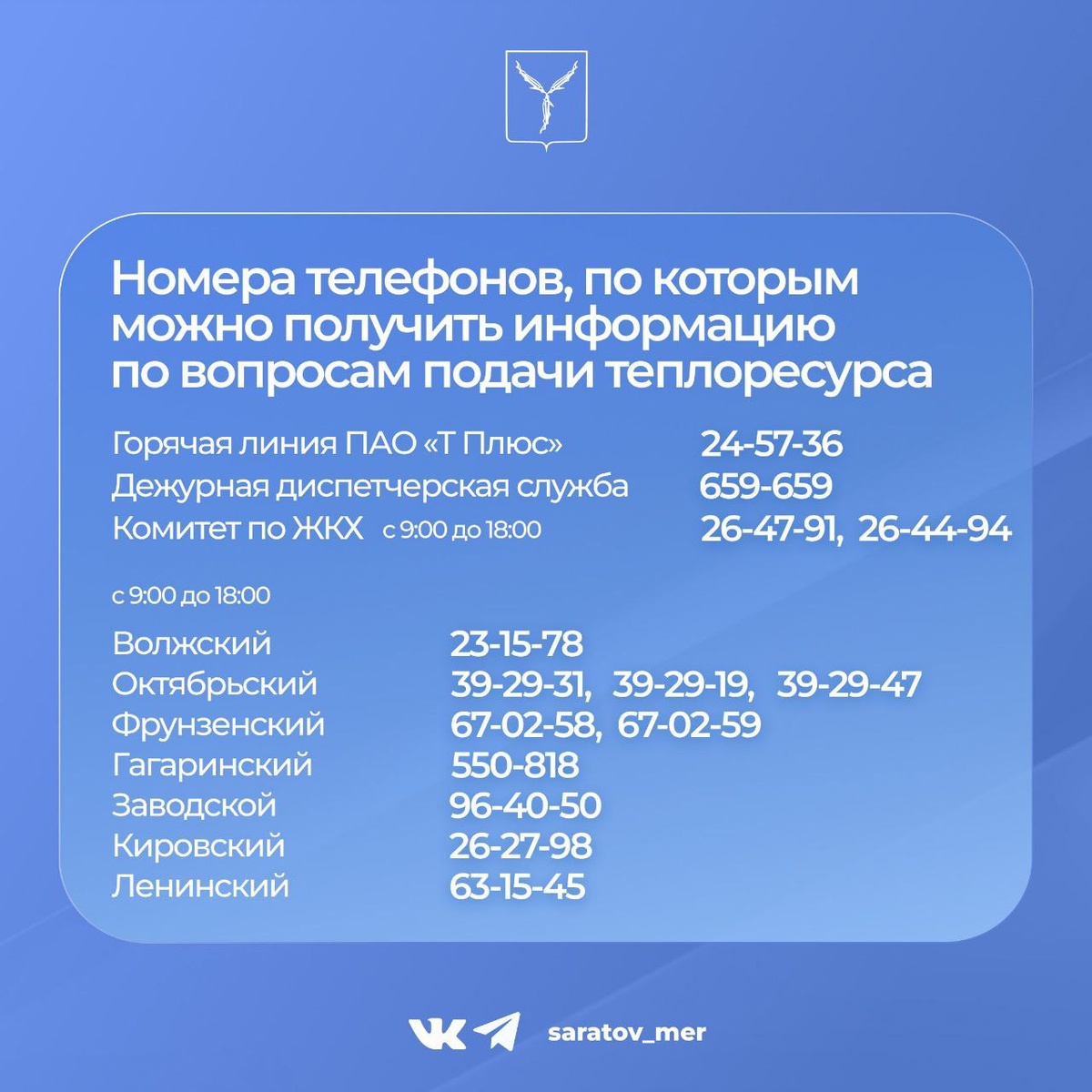 Номера телефонов, по которым можно получить информацию по вопросам подачи теплоресурса: Напомним, в этом году отопительный сезон для многоквартирных домов в Саратове и Энгельсе начался 14 октября.