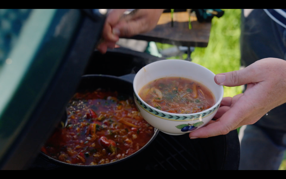 Ну, а чесночок и зелень закинем в самом конце. Сейчас этому супу нужно минут 40 потомиться. Закрываем крышкой, закрываем гриль. Пошел процесс томления. Через 40 минут, друзья, будем подходить к финалу.