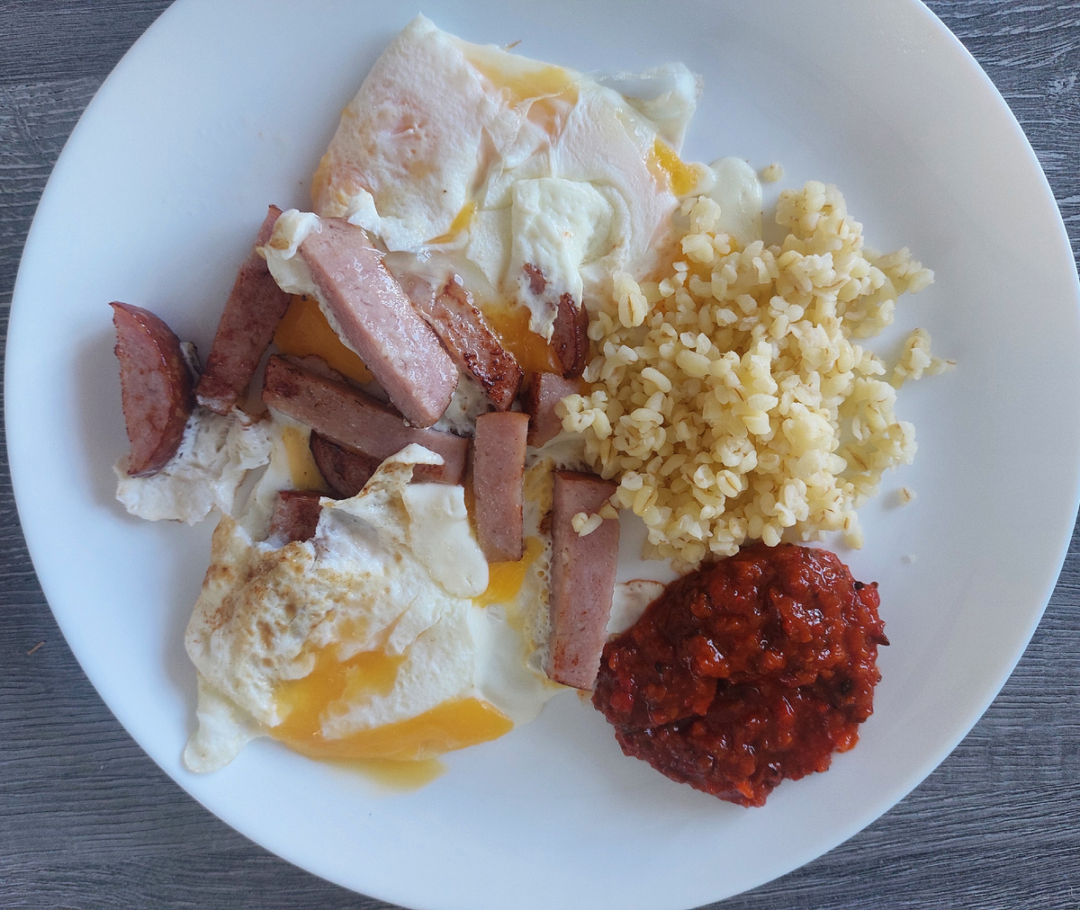 Завтракаю я дома. Купила в магазине яйца, булгур, колбасы палочку и грибную икру. Пока жарится яичница с колбасой, включаю кофемашину, и уже через несколько минут ароматный кофе у меня в кружке.